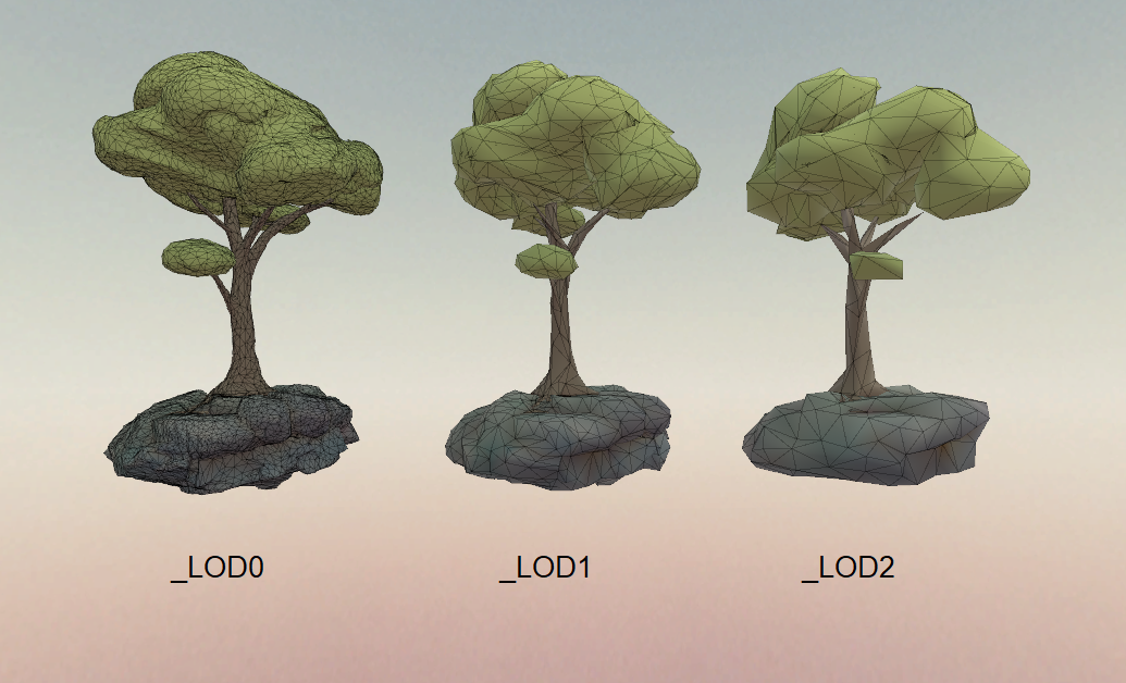 Tvori finds all models that ends with _LOD0, _LOD1, _LOD2 and set up them as LODs.